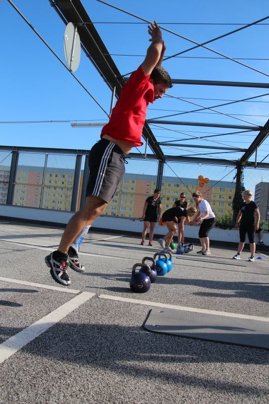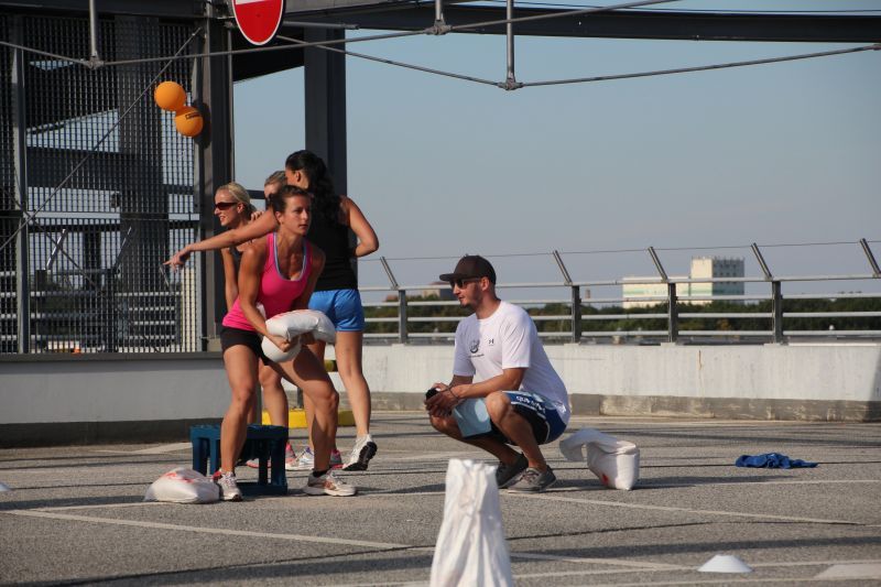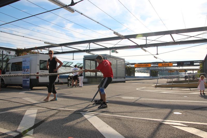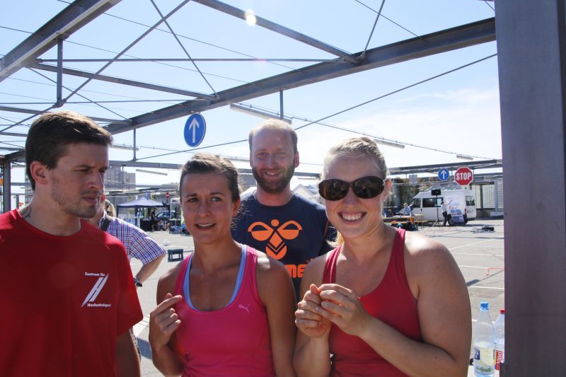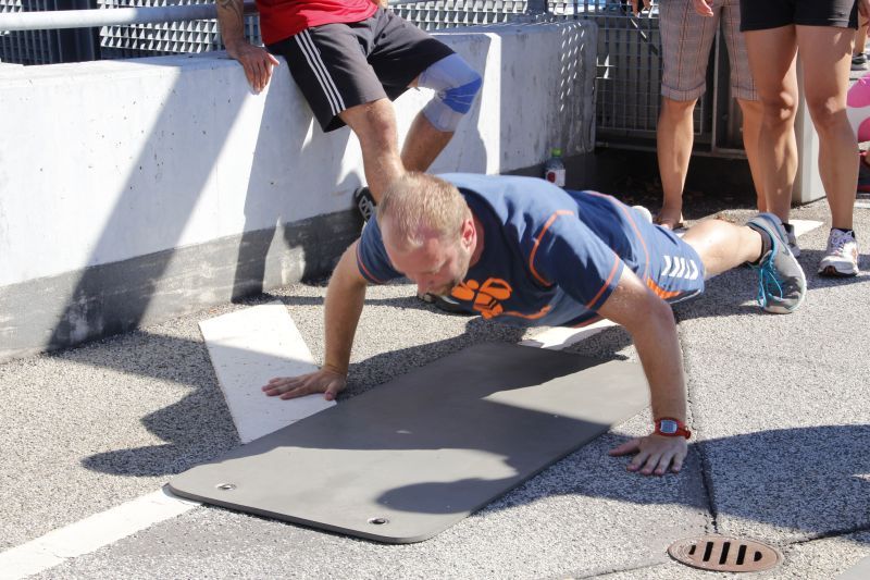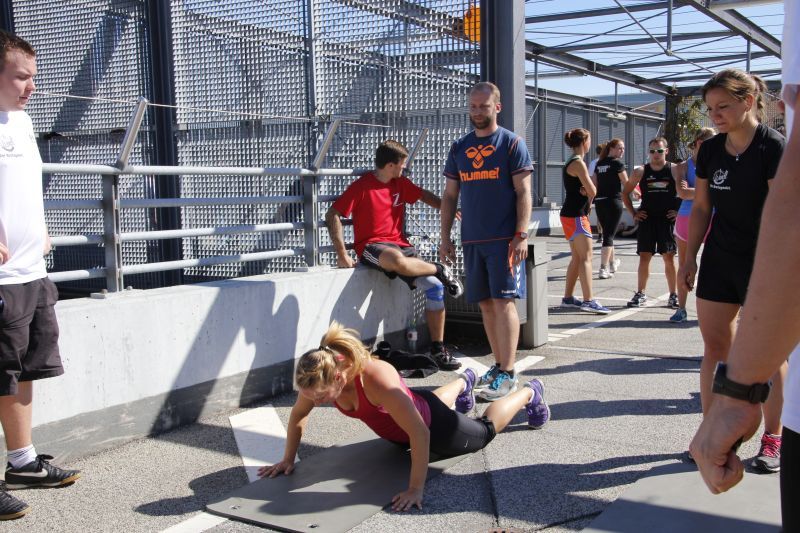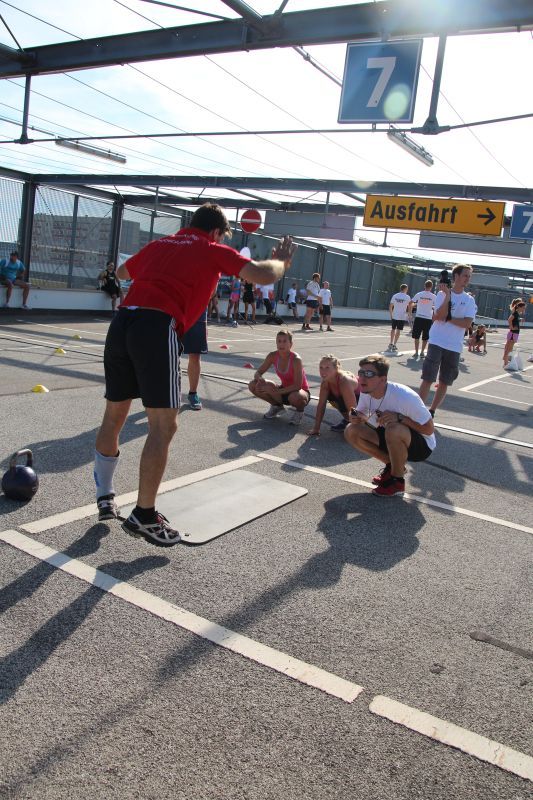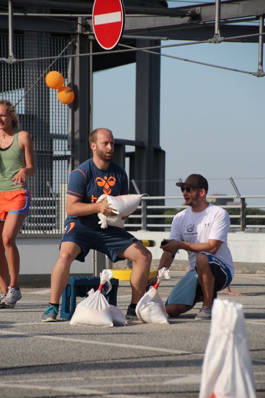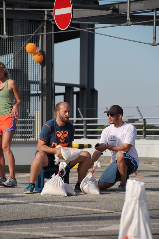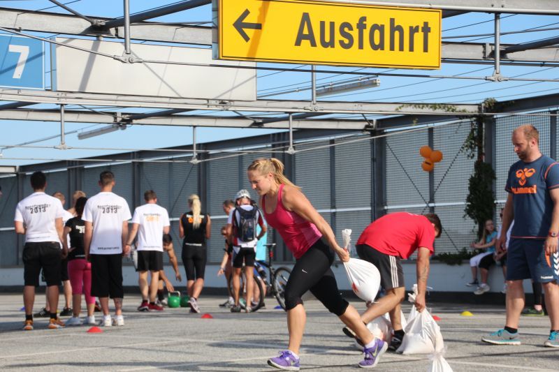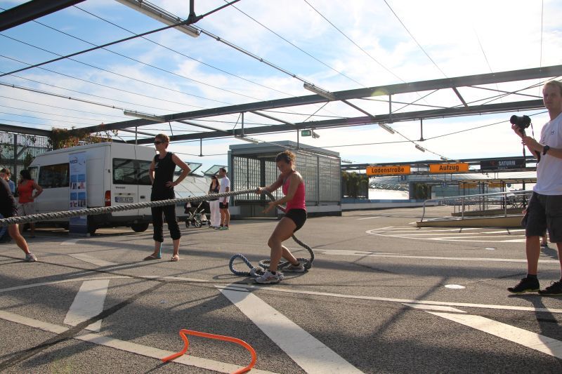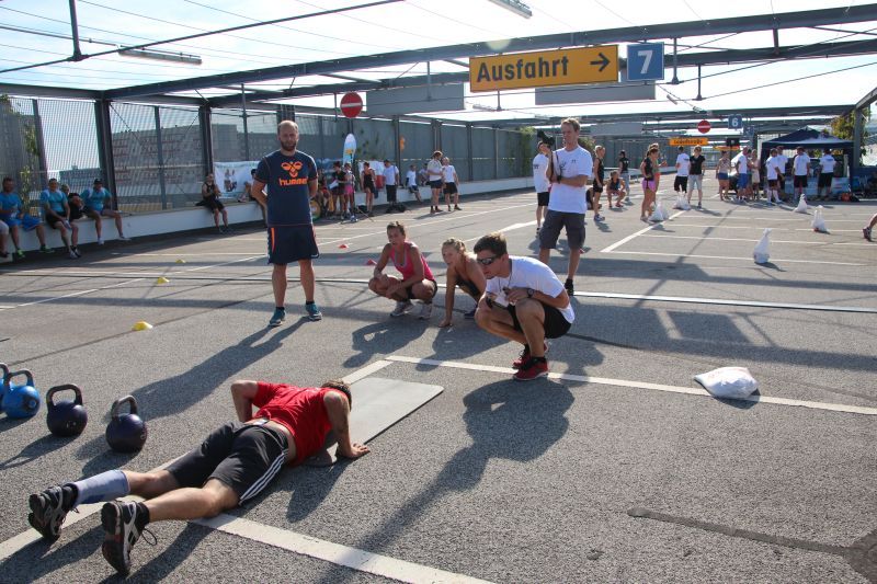 Bei blauen Himmel und strahlenden Sonnenschein trafen sich insgesamt 18 Teams auf dem oberen Parkdeck des Alleecenter in Grünau. Nach einer militärisch anmutenden Erwärmung mussten insgesamt sechs Stationen (der Veranstalter sprach von Challenges) bewältigt werden.