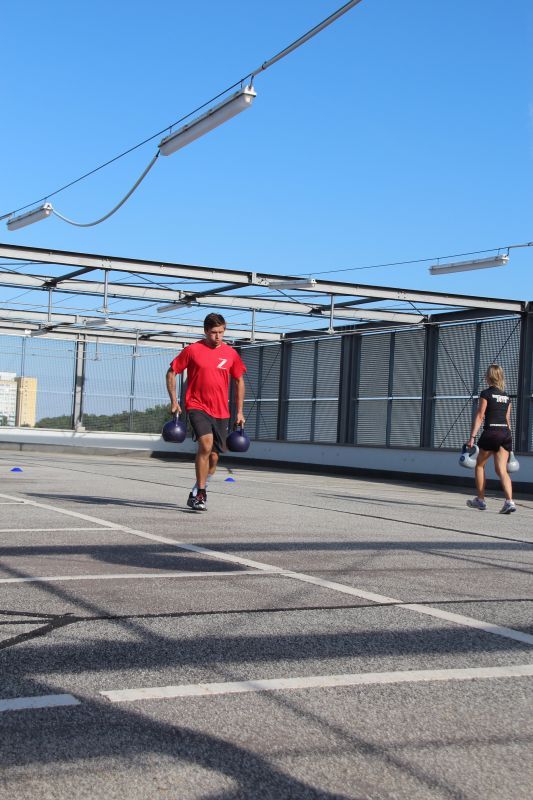 Farmers: 2x 16 kg Klettletbells über eine Distanz tragen und anschließend Soldatensprünge (Booties)