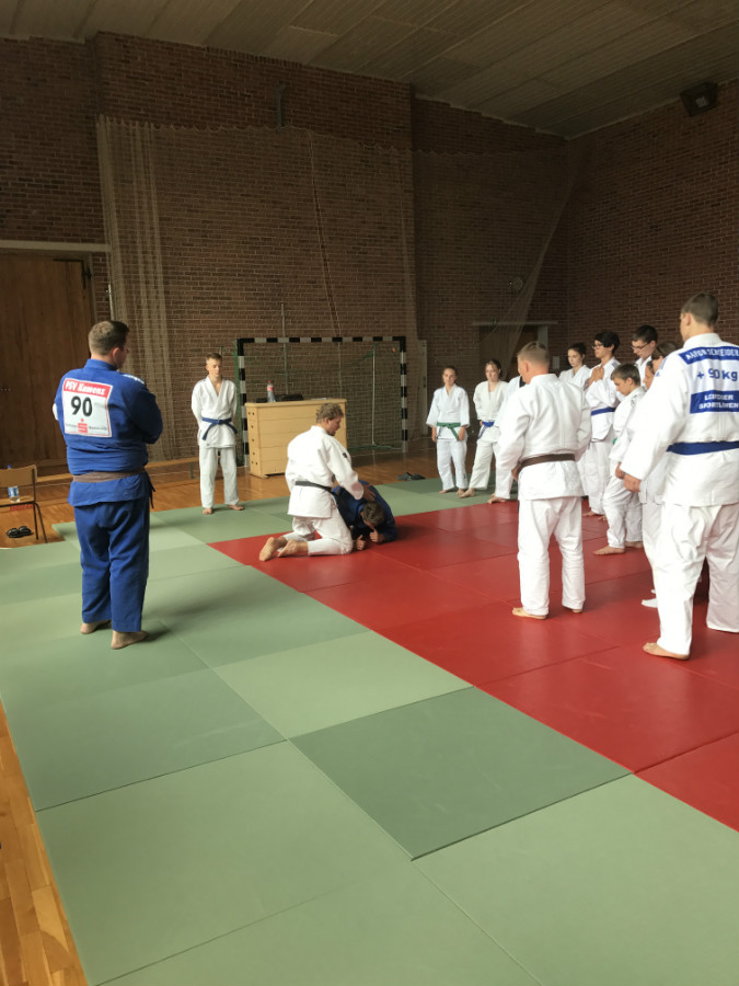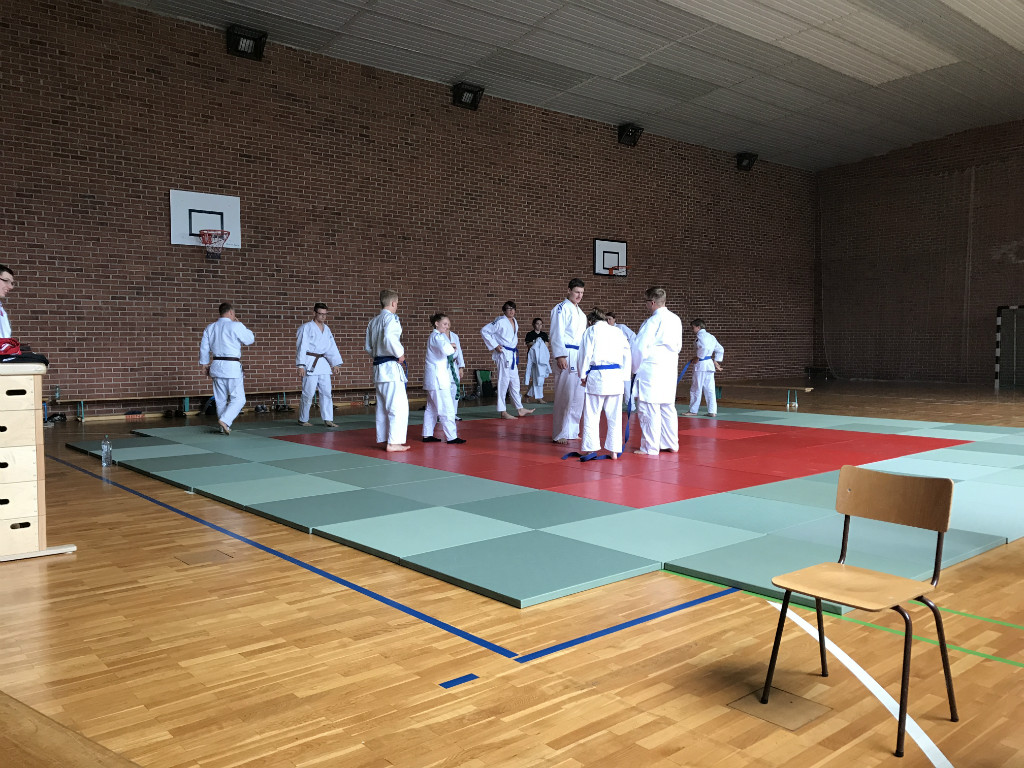 Der nächste Morgen war dann glücklicherweise nicht wieder theoretischer Natur. Vielmehr ging es dann mal richtig ans Schiedsen. Dafür wurden sowohl Kampfrichter, als auch Kämpfer eingeteilt und ein kleiner Wettkampf simuliert. Da es einige Zeit in Anspruch nahm, bis alle mindestens einmal Kampfrichter waren (immerhin waren wir fast 20 Leute) zog sich das sogar noch bis nach dem Mittagessen hin. Um 13:30 Uhr gab es dann eine Klausur zur Listenführung. Danach ging es weiter mit Übungskämpfen, gefolgt von der Analyse einiger Videoschnipsel.