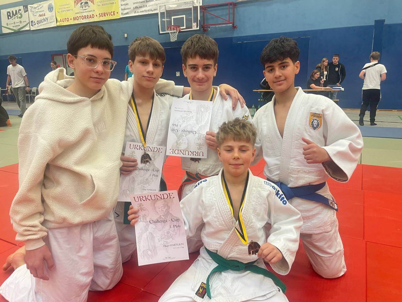 In der U15 traten Bruno Reitmann, Hugo Hartlich, Felix Voßler und Hamza Khalifa an. Bruno verlor zwar seinen Auftaktkampf, legte danach aber drei Ippon-Siege hin und holte Bronze. Hugo sicherte sich souverän Gold nach zwei klaren Erfolgen, genau wie Felix, der seinen Turniertag ebenfalls dominant gestaltete und ganz oben auf dem Treppchen landete. Hamza kämpfte mutig in einer höheren Gewichtsklasse, musste sich dort aber knapp geschlagen geben.