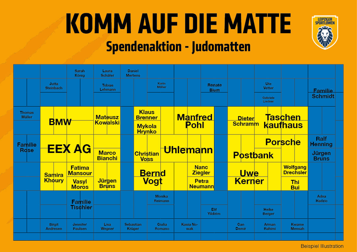 „Komm auf die Judo-Matte“ – das ist nicht nur das Motto unserer Kampagne, sondern auch genau so gemeint. Alle Unterstützenden werden – auf Wunsch – auf einer großen Wandtafel in unserer Halle verewigt. Dort ist unsere neue Mattenfläche symbolisch dargestellt, und die Namen erscheinen – je nach Spendenhöhe – in unterschiedlicher Schriftgröße, ganz wie in einer Wortwolke.