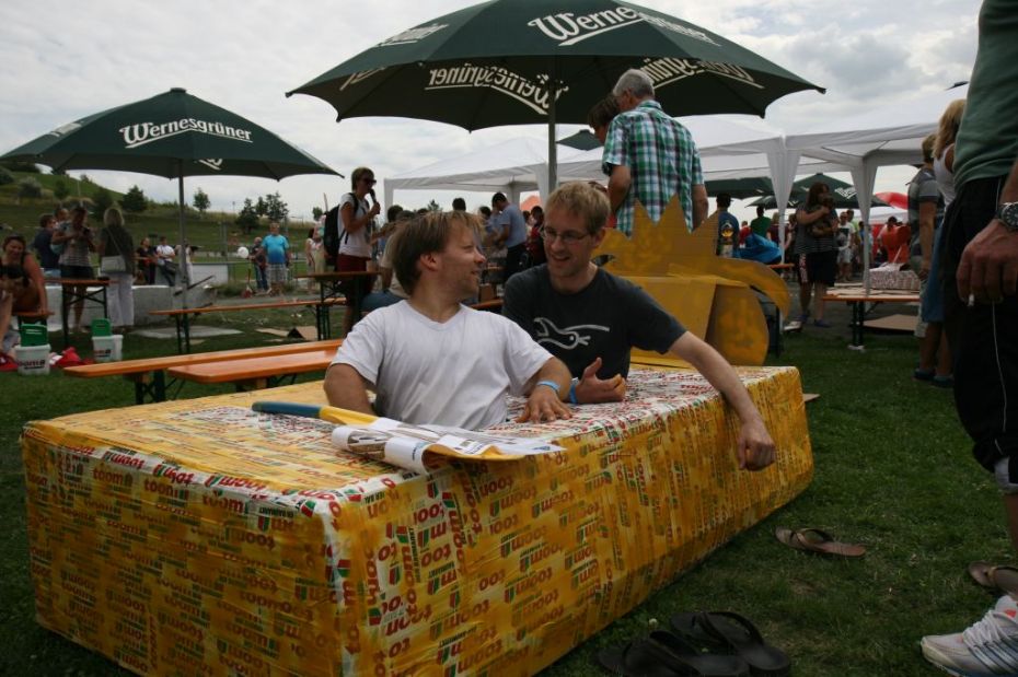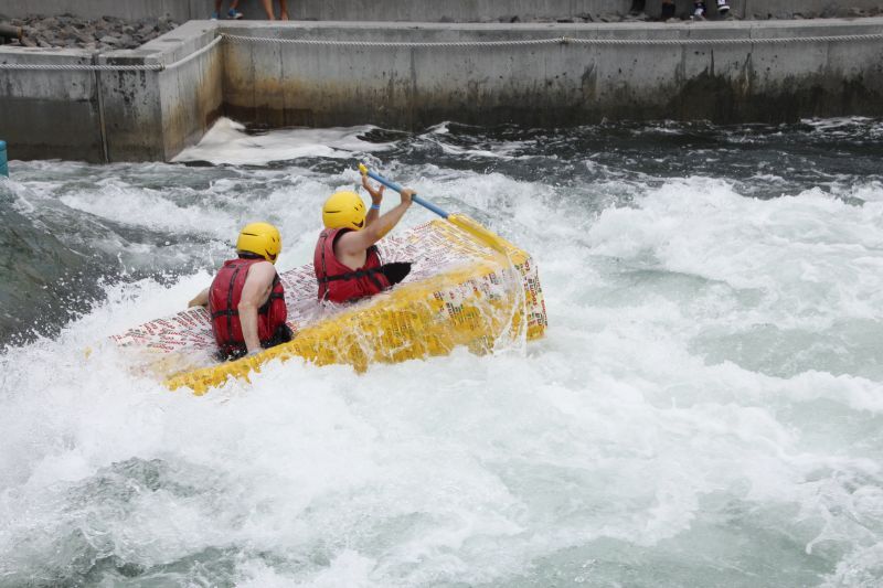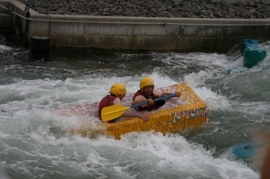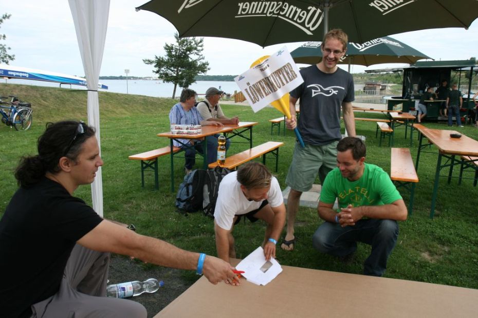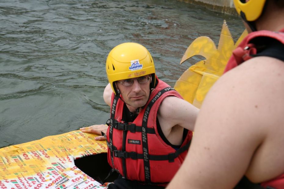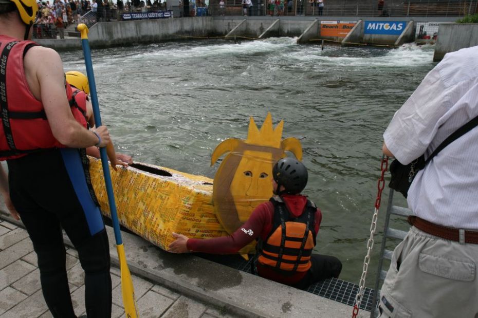 Ein Sieg sprang beim 7. Pappbootrennen leider nicht heraus. Doch das war beim sehr gut besuchten Spaß-Rennen auch zweitrangig. Vor mehr als 7.000 Zuschauern glitt der Löwenkutter majestätisch und sicher den Wildwasserkanal am Markleeberger See herunter. Kapitän Thomas Necke konnte beim Bau des stolzen Dampfers (für die Bezeichnung Rennboot war die Zeit dann doch zu schlecht) auf eine erfahrene Leichtmatrosen-Crew zurückgreifen: Trainer André Korb, Johannes Wiegand, Marko Reitmann und André Barthel konzipierten und formten aus Pappe und Klebeband den schnittigen gelben Zweisitzer. Thomas übernahm das Steuer und der nautische Wachoffizier Johannes sorgte für den Vortrieb. Dieser bestand nach einem Viertel der Strecke aus energischen Arm- und Handbewegungen, da Matrose Johannes sein Paddel verloren hatte (siehe Video). Der Wille war da …