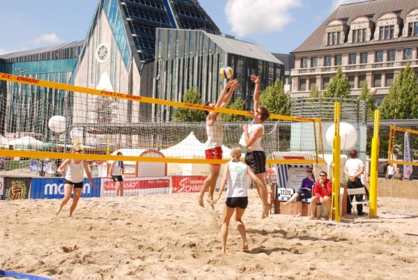 Beachvolleyball für Jedermann vom 10. bis 15. Juli auf dem Leipziger Augustusplatz mitten in der City.Sommer, Sonne und tonnenweise Sand! In wenigen Wochen heißt es in Leipzigs Innenstadt bei SachsenBeach 2013 wieder „Runter von den Tribünen! Rauf auf den Sand!“. Die Agentur DREIECK MARKETING richtet vom 10. bis 15. Juli 2013 das in der Beachvolleyball-Szene beliebte Event mitten in Leipzigs City in der fünften Auflage aus. An sechs Tagen können Beachvolleyballfans aus ganz Deutschland auf sechs Courts rund um den Augustusplatz mit toller Kulisse vor Oper, Gewandhaus und Paulinerkirche die Beachvolleybälle schmettern. Dem Publikum werden auch in diesem Jahr wieder viele spannende Turniere zum Zuschauen und Mitfiebern geboten, z.B. das Firmenturnier, die Studententurniere oder dieses Jahr neu das Bad-Taste-Turnier, bei welchem sich die Teams vor Ort in schrägen Beachoutfits in den Sand wagen. Daneben sorgen Musik, Strandatmosphäre sowie unsere Cateringanbieter vor Ort für ein Ambiente bei SachsenBeach, bei welchem jeder gerne verweilt. Allein im letzten Jahren haben rund 8.000 Zuschauer die einzigartige Atmosphäre genossen und es sich in den Liegestühlen bequem gemacht. Der Eintritt ist für alle Zuschauer wie immer frei.