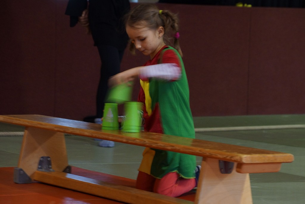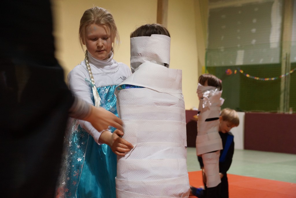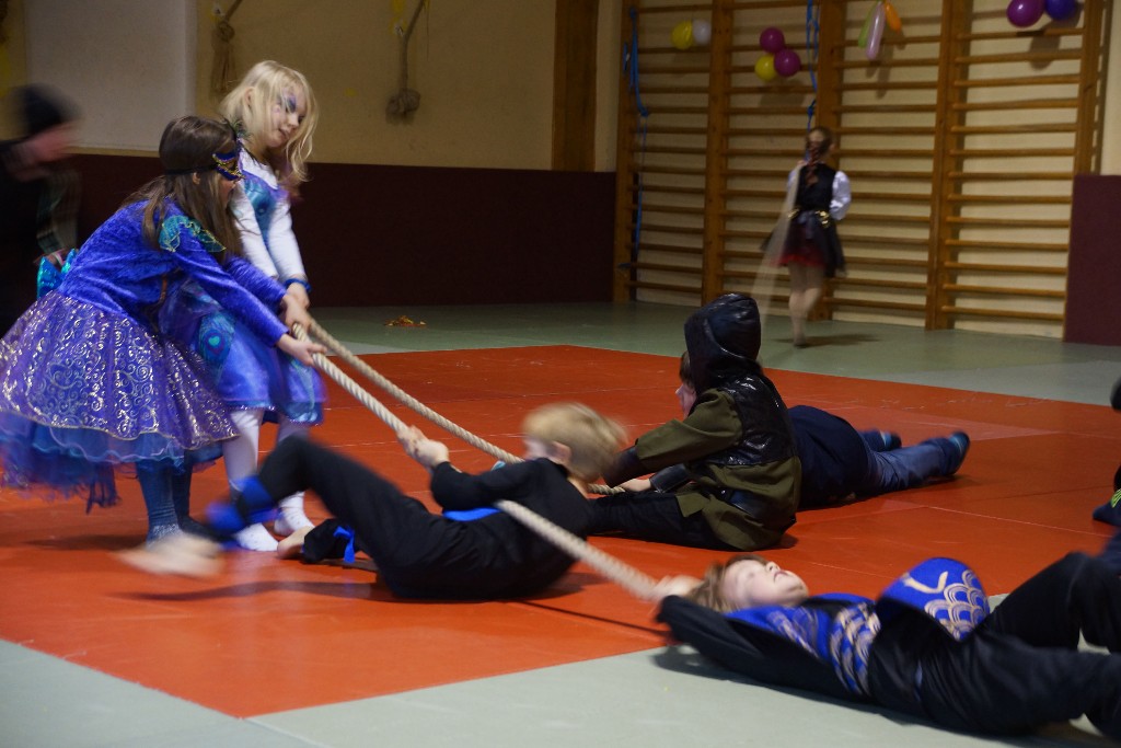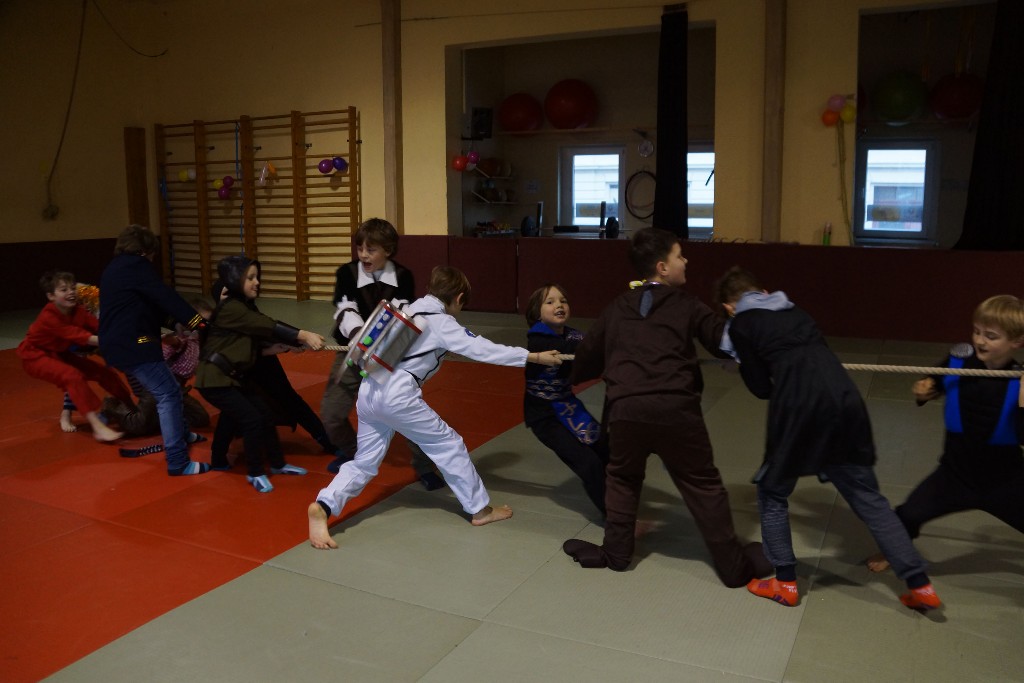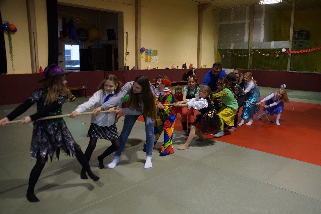Dann konnten auch schon die allseits beliebten Partyspiele gestartet werden. Den Anfang machte hier „Topfschlagen“, gefolgt von einer kurzen Essenspause. Im Anschluss daran begannen die Staffelspiele: Zwei Teams traten gegeneinander in den Disziplinen „Eierlauf“ und „Pappbecher-Pyramidenbau“ an, wobei statt Eiern karnevalstypisch Bonbons verwendet wurden. Das Highlight des Tages war jedoch der nächste Programmpunkt: Die Teams vereinigten sich wieder, um beim „Tauziehen“ eine schier aussichtslose Aufgabe in Angriff zu nehmen, ihr Gegner war nämlich der zweifache Kraftdreikampf-Weltmeister Lion Lowag. Doch den kleinen Sportlöwen gelang die Überraschung: Ohne mit der Wimper zu zucken, besiegten sie den Favoriten chancenlos und konnten jubeln, während sich unser Auszubildender Sport- und Fitnesskaufmann Lion geschlagen geben musste. Aber selbst dieser Kraftakt war scheinbar noch nicht genug, deshalb teilte sich das Gewinnerteam wieder und es entbrannte ein weiteres „Tauzug-Duell“.