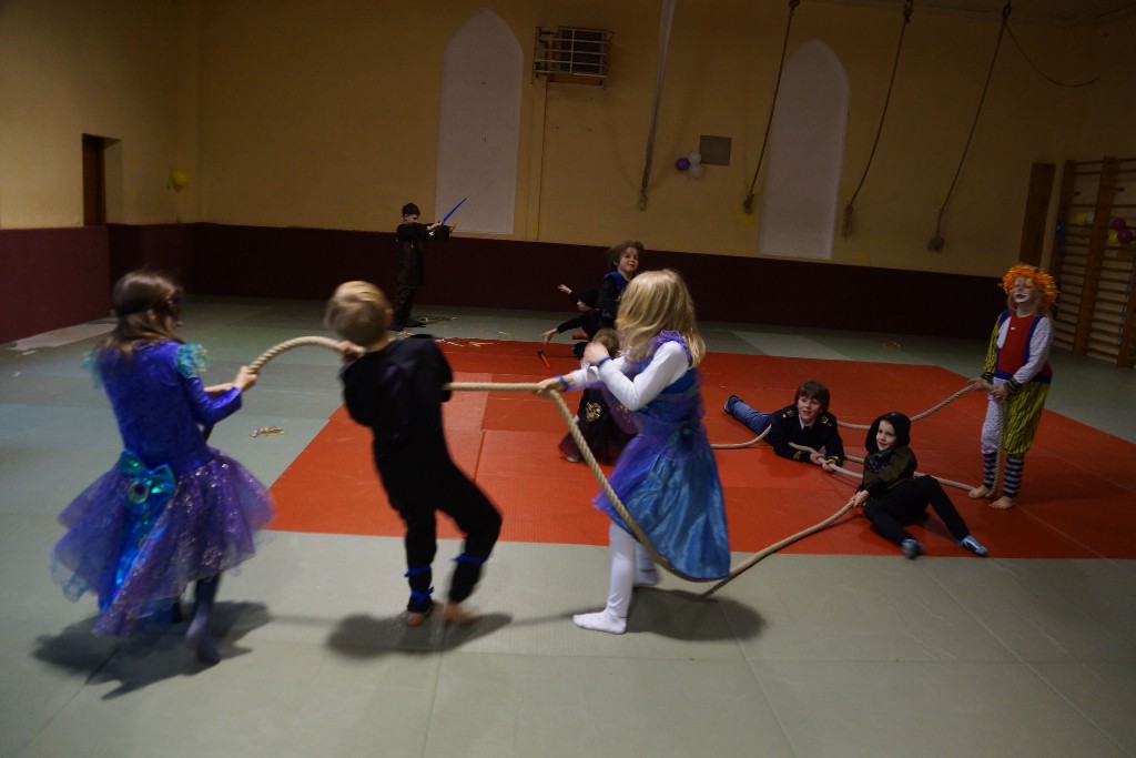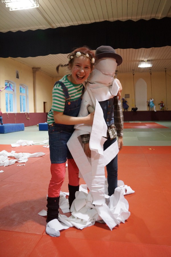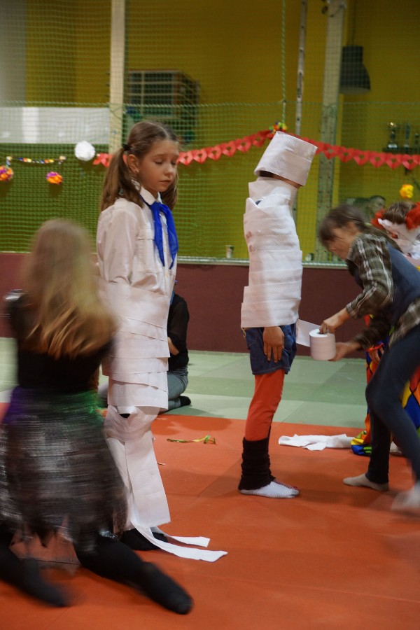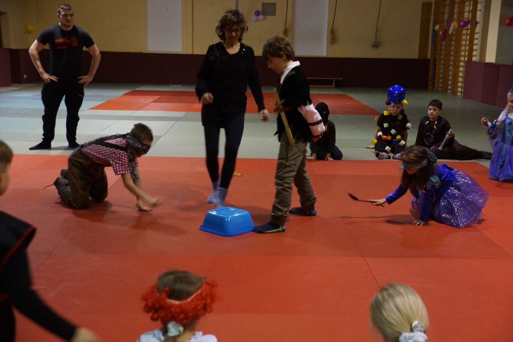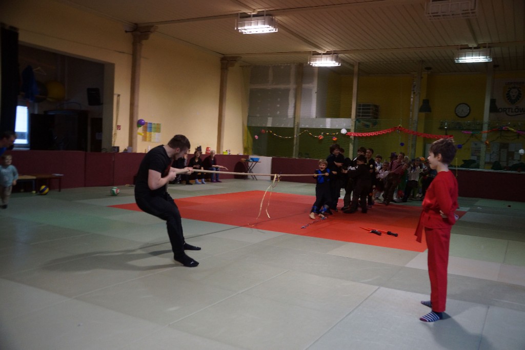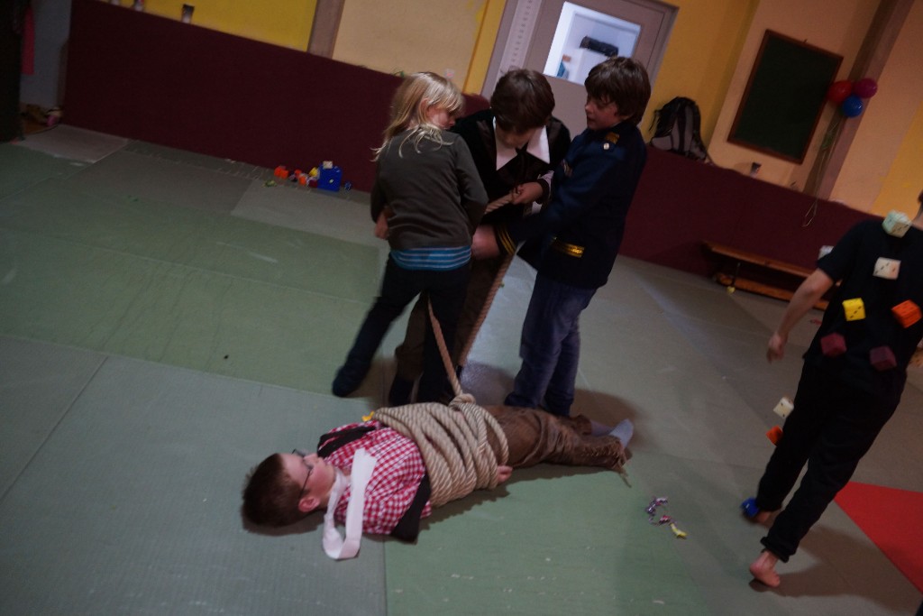 Dann konnten auch schon die allseits beliebten Partyspiele gestartet werden. Den Anfang machte hier „Topfschlagen“, gefolgt von einer kurzen Essenspause. Im Anschluss daran begannen die Staffelspiele: Zwei Teams traten gegeneinander in den Disziplinen „Eierlauf“ und „Pappbecher-Pyramidenbau“ an, wobei statt Eiern karnevalstypisch Bonbons verwendet wurden. Das Highlight des Tages war jedoch der nächste Programmpunkt: Die Teams vereinigten sich wieder, um beim „Tauziehen“ eine schier aussichtslose Aufgabe in Angriff zu nehmen, ihr Gegner war nämlich der zweifache Kraftdreikampf-Weltmeister Lion Lowag. Doch den kleinen Sportlöwen gelang die Überraschung: Ohne mit der Wimper zu zucken, besiegten sie den Favoriten chancenlos und konnten jubeln, während sich unser Auszubildender Sport- und Fitnesskaufmann Lion geschlagen geben musste. Aber selbst dieser Kraftakt war scheinbar noch nicht genug, deshalb teilte sich das Gewinnerteam wieder und es entbrannte ein weiteres „Tauzug-Duell“.