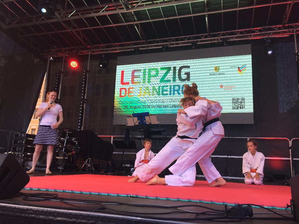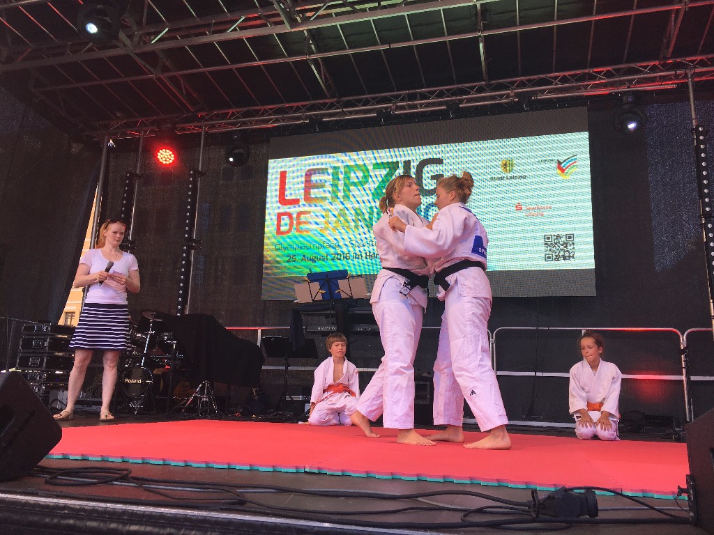 Bei sommerlichen 30 Grad haben sich die U10 und U14 Trainingsgruppen der Leipziger Sportlöwen in der Leipziger Innenstadt getroffen, um gemeinsam Eis zu essen und die Show auf dem Marktplatz bei “Leipzig de Janeiro” zu bestaunen. Die Zuschauer sahen eine kurzweilige Choreografie von Lisa Müller, Marie Branser, Edo Dieckmann und Sarah Müller. Moderiert wurde der Judo-Show-Auftritt von der Olympia-Dritten von 2004 Annett Böhm.