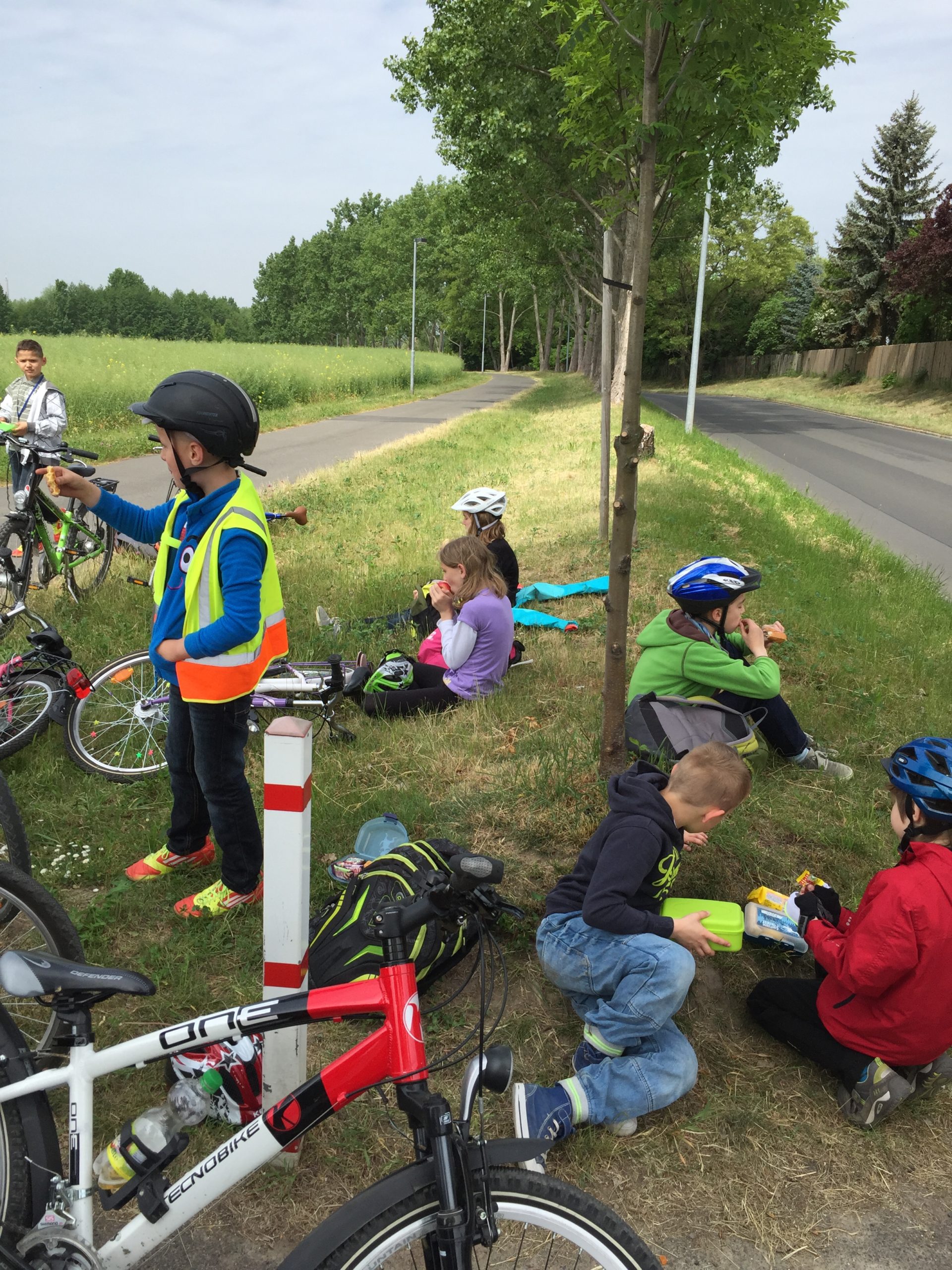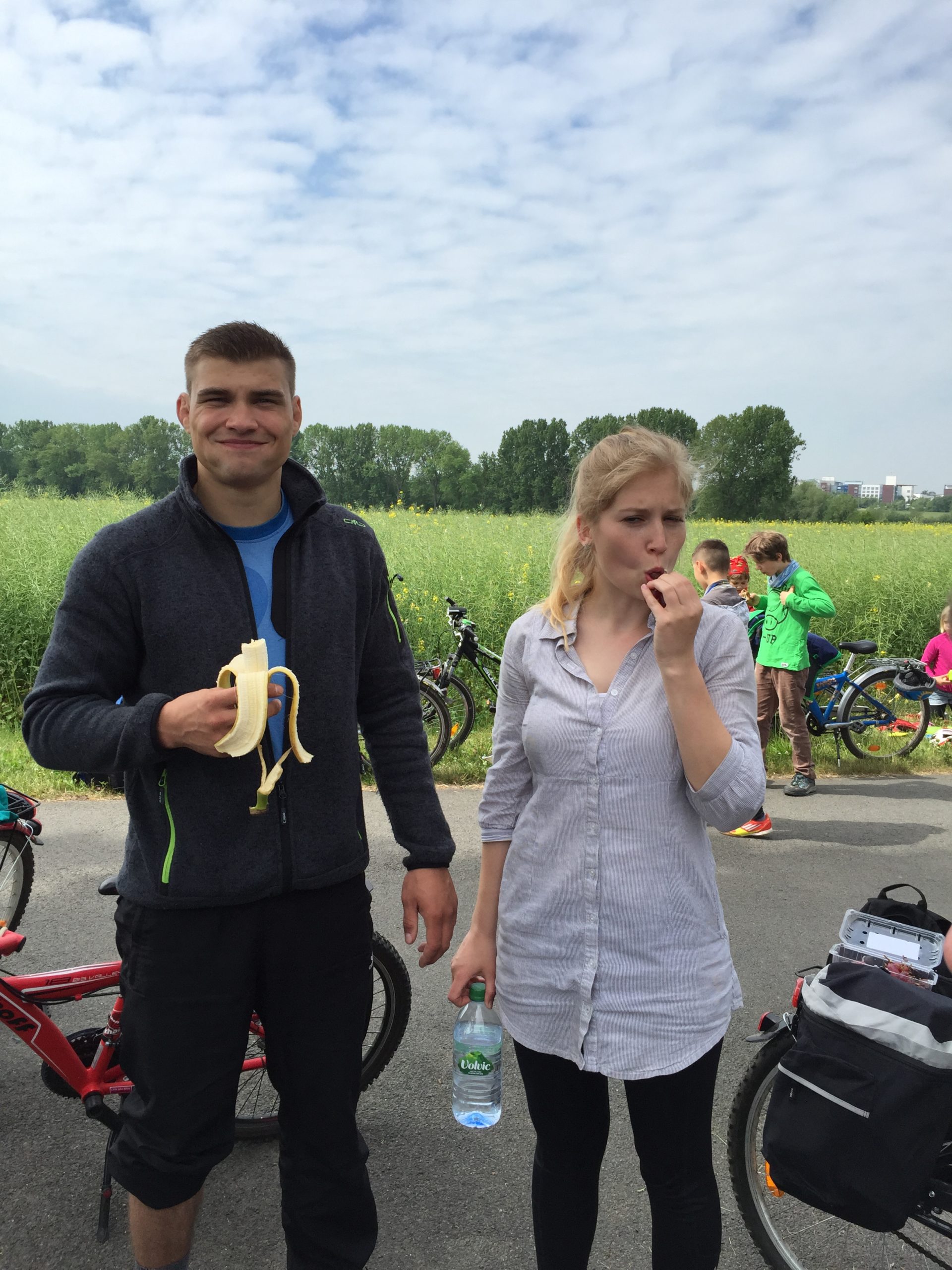 Natürlich viel zu früh begann der nächste Morgen mit dem Frühstück. Im Anschluss machten sich alle auf, um eine kleine Runde um den Schladitzer See zu radeln. Doch was war das? Mineas Reifen war Opfer einer bösen Stichattacke einer Dorne geworden, deshalb musste die Gruppe sich aufteilen. Minea kam mitsamt ihres Reparaturpersonals nach, während der Rest der Gruppe vorfuhr, um einen geeigneten Badeplatz auszukundschaften. Dieser war auch schnell gefunden und alle machten sich auf ins kühle Nass. Nach der Abkühlung wies Trainer Tino Rose die Gruppe auf den großen Stein am Ufer hin. War das die Achse der Erde? Das lässt sich natürlich nur durch graben herausfinden und alle gaben sich die größte Mühe das Geheimnis zu lüften. Leider erwies sich der Plan als aussichtslos und die Sportlöwen mussten unverrichteter Dinge wieder abziehen. Zum Glück gab es noch ein Trostpflaster kurz vor der Ankunft: Eine Eispause hilft gegen beinahe alle Probleme!