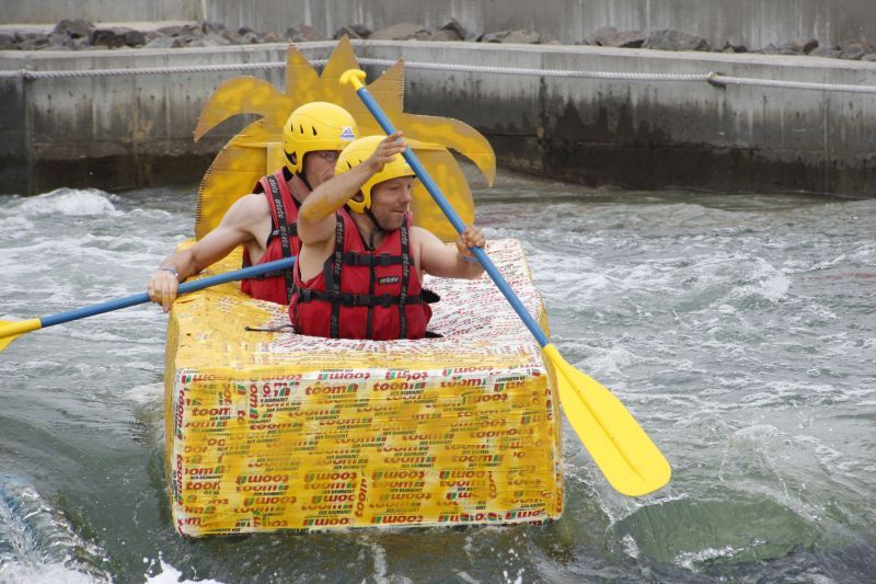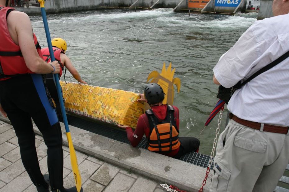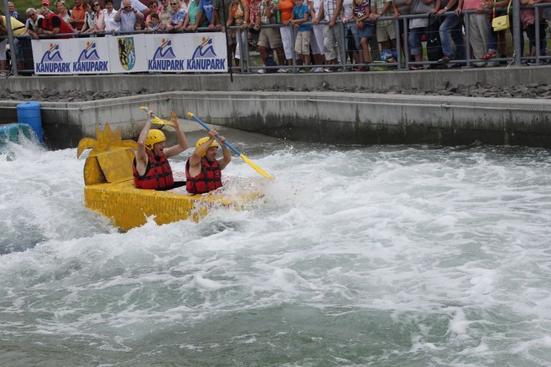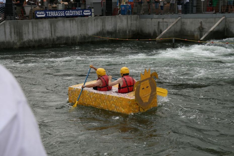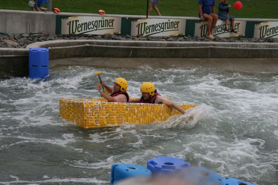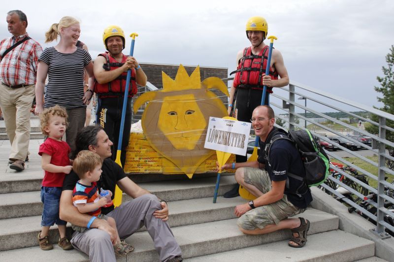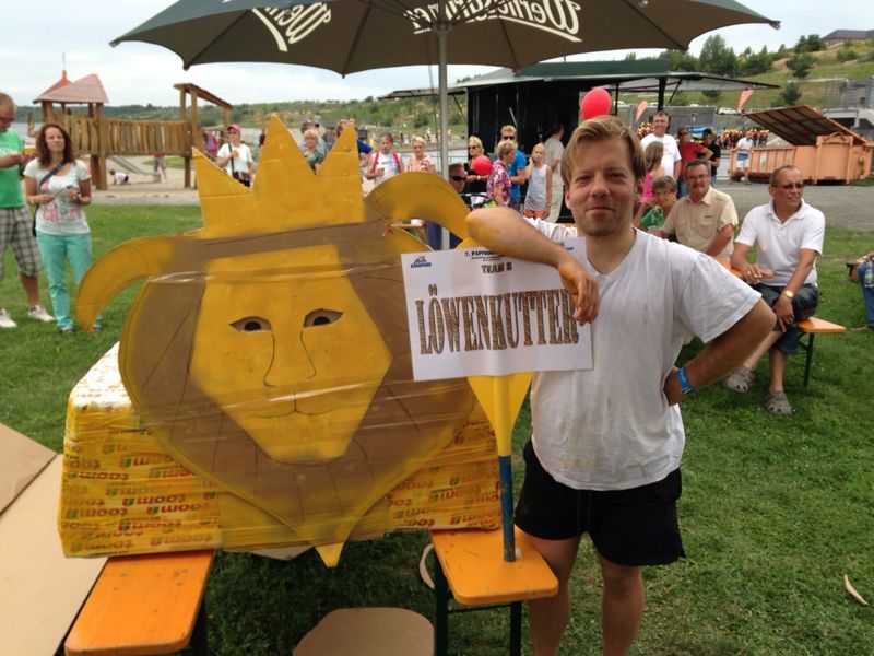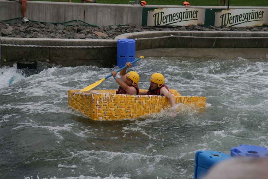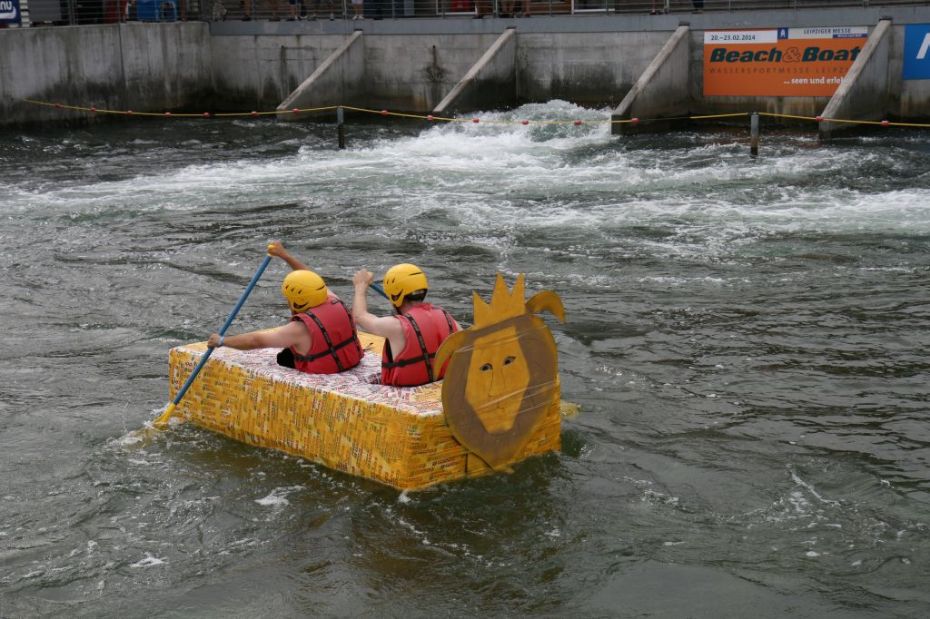 Ein Sieg sprang beim 7. Pappbootrennen leider nicht heraus. Doch das war beim sehr gut besuchten Spaß-Rennen auch zweitrangig. Vor mehr als 7.000 Zuschauern glitt der Löwenkutter majestätisch und sicher den Wildwasserkanal am Markleeberger See herunter. Kapitän Thomas Necke konnte beim Bau des stolzen Dampfers (für die Bezeichnung Rennboot war die Zeit dann doch zu schlecht) auf eine erfahrene Leichtmatrosen-Crew zurückgreifen: Trainer André Korb, Johannes Wiegand, Marko Reitmann und André Barthel konzipierten und formten aus Pappe und Klebeband den schnittigen gelben Zweisitzer. Thomas übernahm das Steuer und der nautische Wachoffizier Johannes sorgte für den Vortrieb. Dieser bestand nach einem Viertel der Strecke aus energischen Arm- und Handbewegungen, da Matrose Johannes sein Paddel verloren hatte (siehe Video). Der Wille war da …