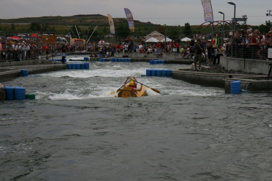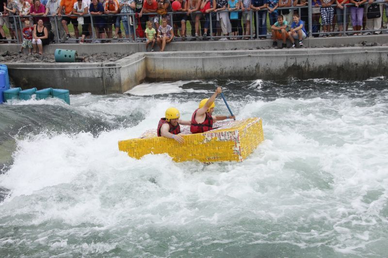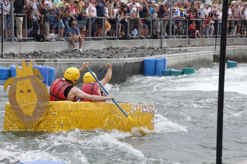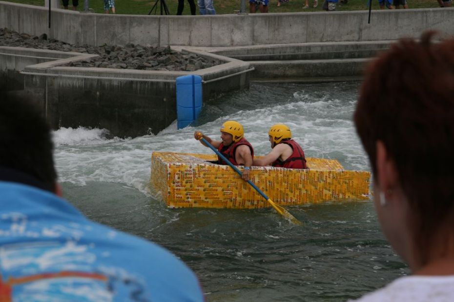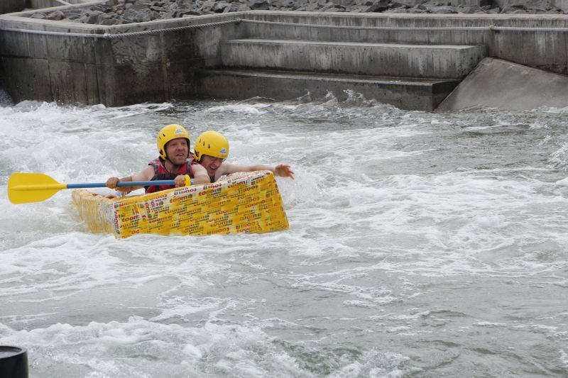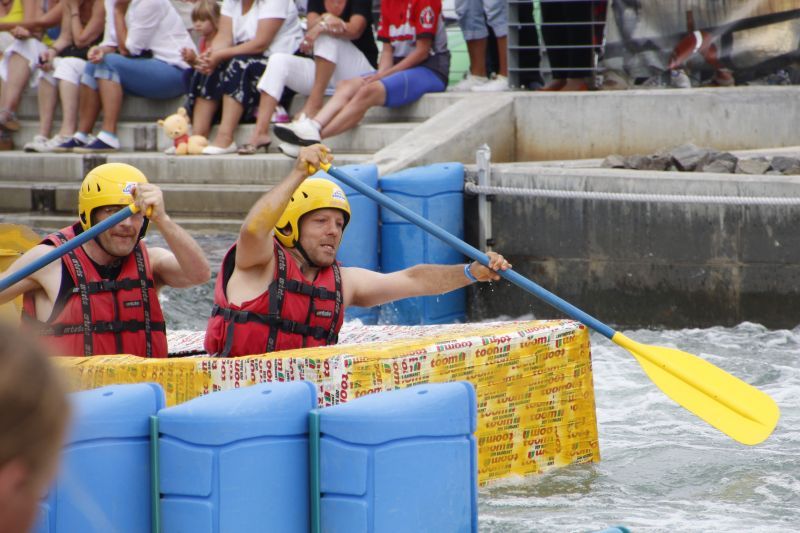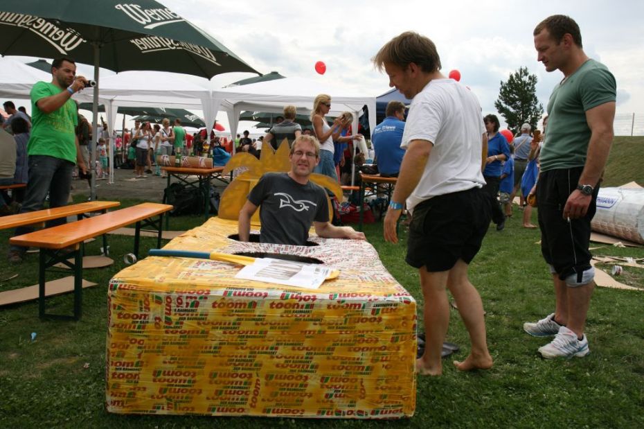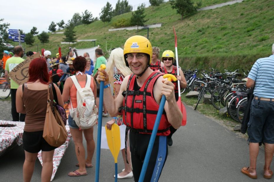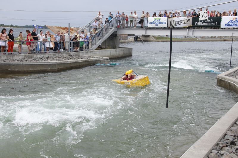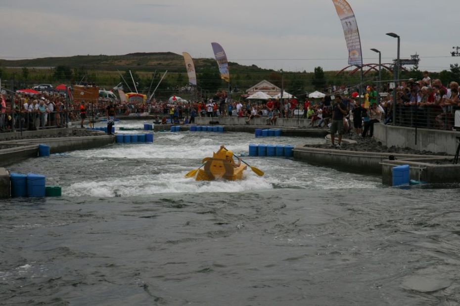 Ein Sieg sprang beim 7. Pappbootrennen leider nicht heraus. Doch das war beim sehr gut besuchten Spaß-Rennen auch zweitrangig. Vor mehr als 7.000 Zuschauern glitt der Löwenkutter majestätisch und sicher den Wildwasserkanal am Markleeberger See herunter. Kapitän Thomas Necke konnte beim Bau des stolzen Dampfers (für die Bezeichnung Rennboot war die Zeit dann doch zu schlecht) auf eine erfahrene Leichtmatrosen-Crew zurückgreifen: Trainer André Korb, Johannes Wiegand, Marko Reitmann und André Barthel konzipierten und formten aus Pappe und Klebeband den schnittigen gelben Zweisitzer. Thomas übernahm das Steuer und der nautische Wachoffizier Johannes sorgte für den Vortrieb. Dieser bestand nach einem Viertel der Strecke aus energischen Arm- und Handbewegungen, da Matrose Johannes sein Paddel verloren hatte (siehe Video). Der Wille war da …