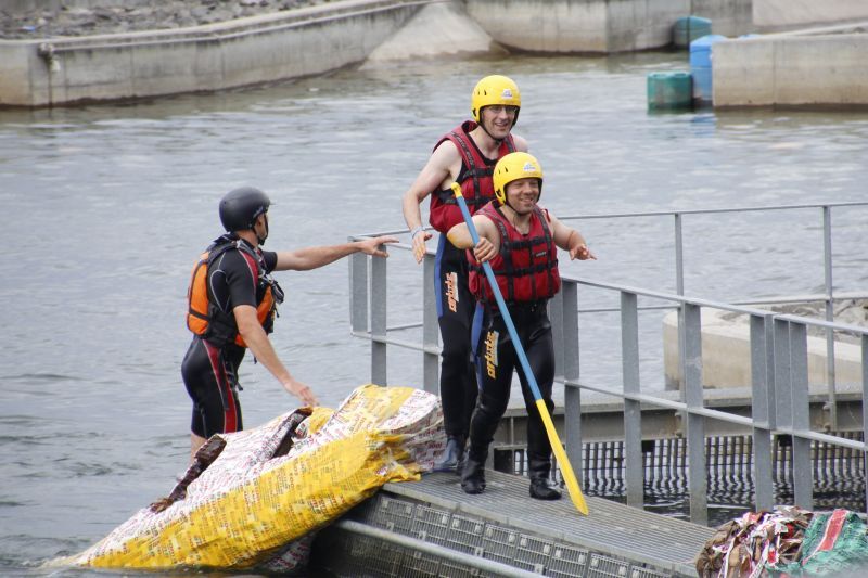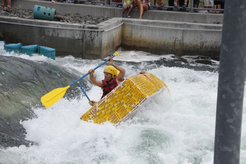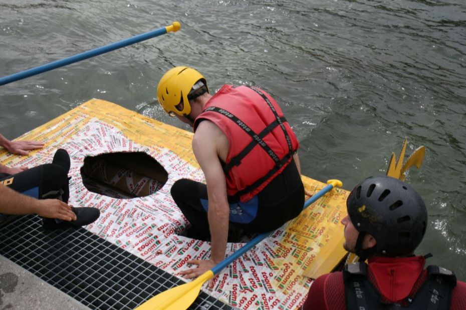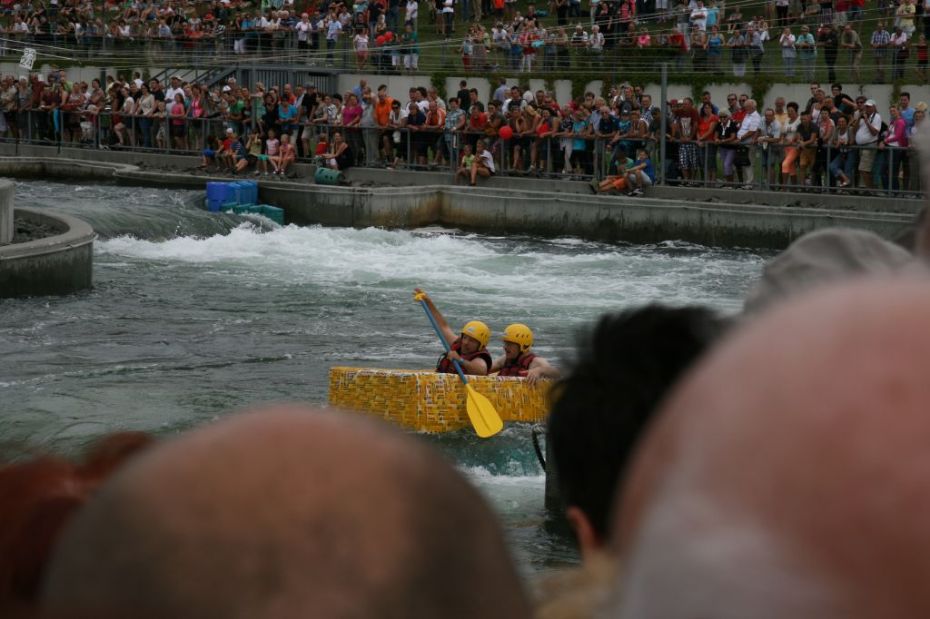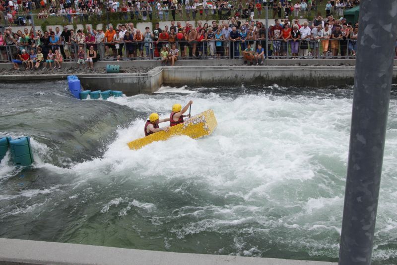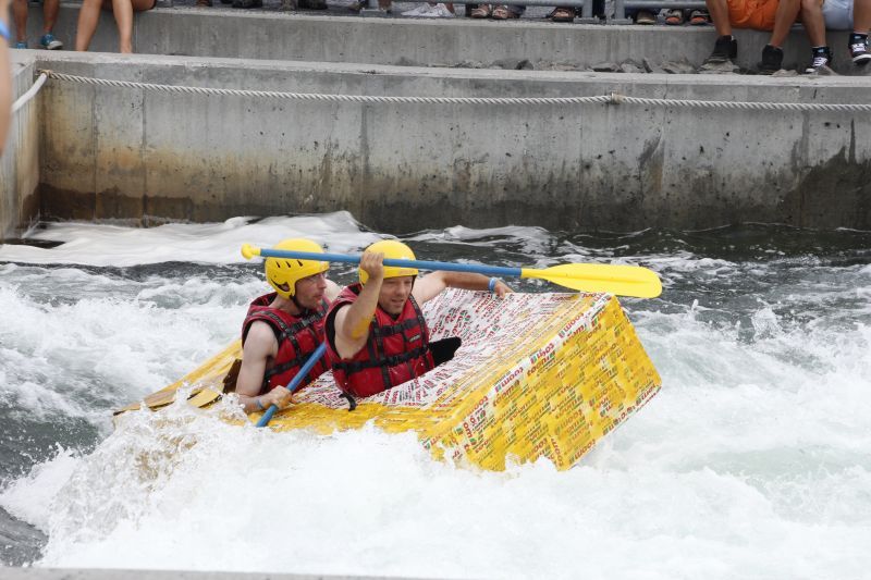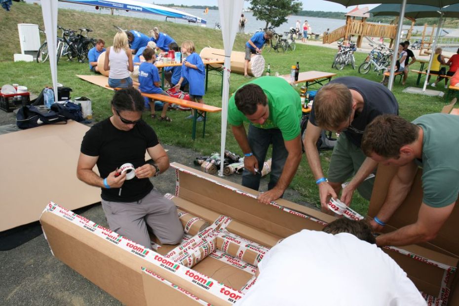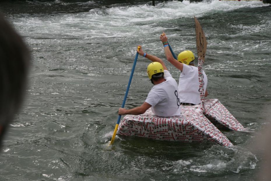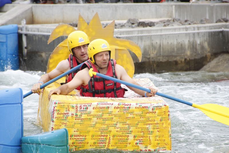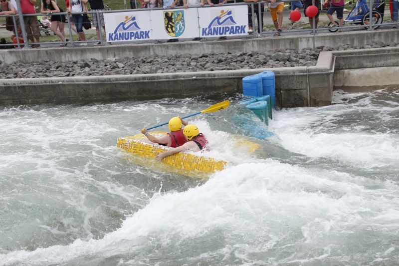 Ein Sieg sprang beim 7. Pappbootrennen leider nicht heraus. Doch das war beim sehr gut besuchten Spaß-Rennen auch zweitrangig. Vor mehr als 7.000 Zuschauern glitt der Löwenkutter majestätisch und sicher den Wildwasserkanal am Markleeberger See herunter. Kapitän Thomas Necke konnte beim Bau des stolzen Dampfers (für die Bezeichnung Rennboot war die Zeit dann doch zu schlecht) auf eine erfahrene Leichtmatrosen-Crew zurückgreifen: Trainer André Korb, Johannes Wiegand, Marko Reitmann und André Barthel konzipierten und formten aus Pappe und Klebeband den schnittigen gelben Zweisitzer. Thomas übernahm das Steuer und der nautische Wachoffizier Johannes sorgte für den Vortrieb. Dieser bestand nach einem Viertel der Strecke aus energischen Arm- und Handbewegungen, da Matrose Johannes sein Paddel verloren hatte (siehe Video). Der Wille war da …