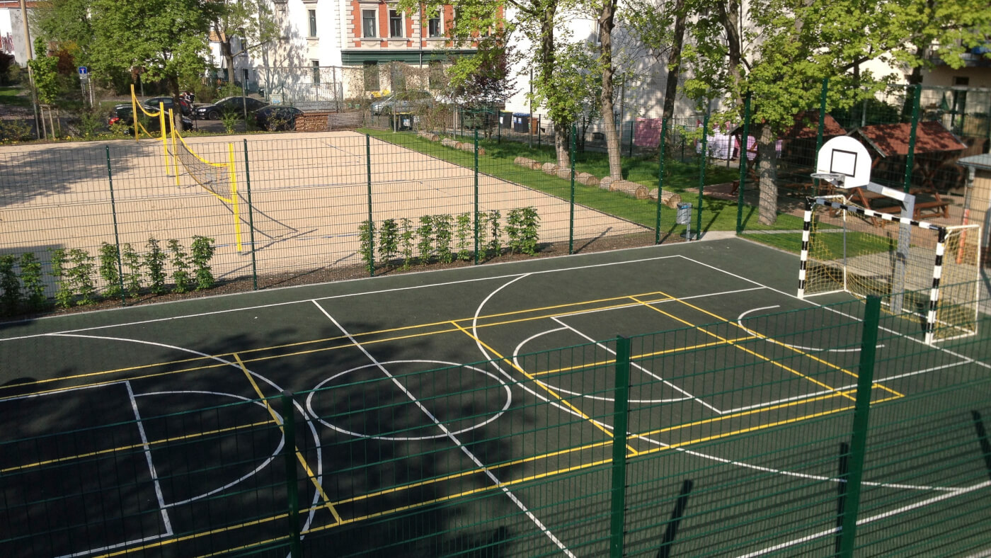 - komplett mit einem Ballfangzaun geschützt