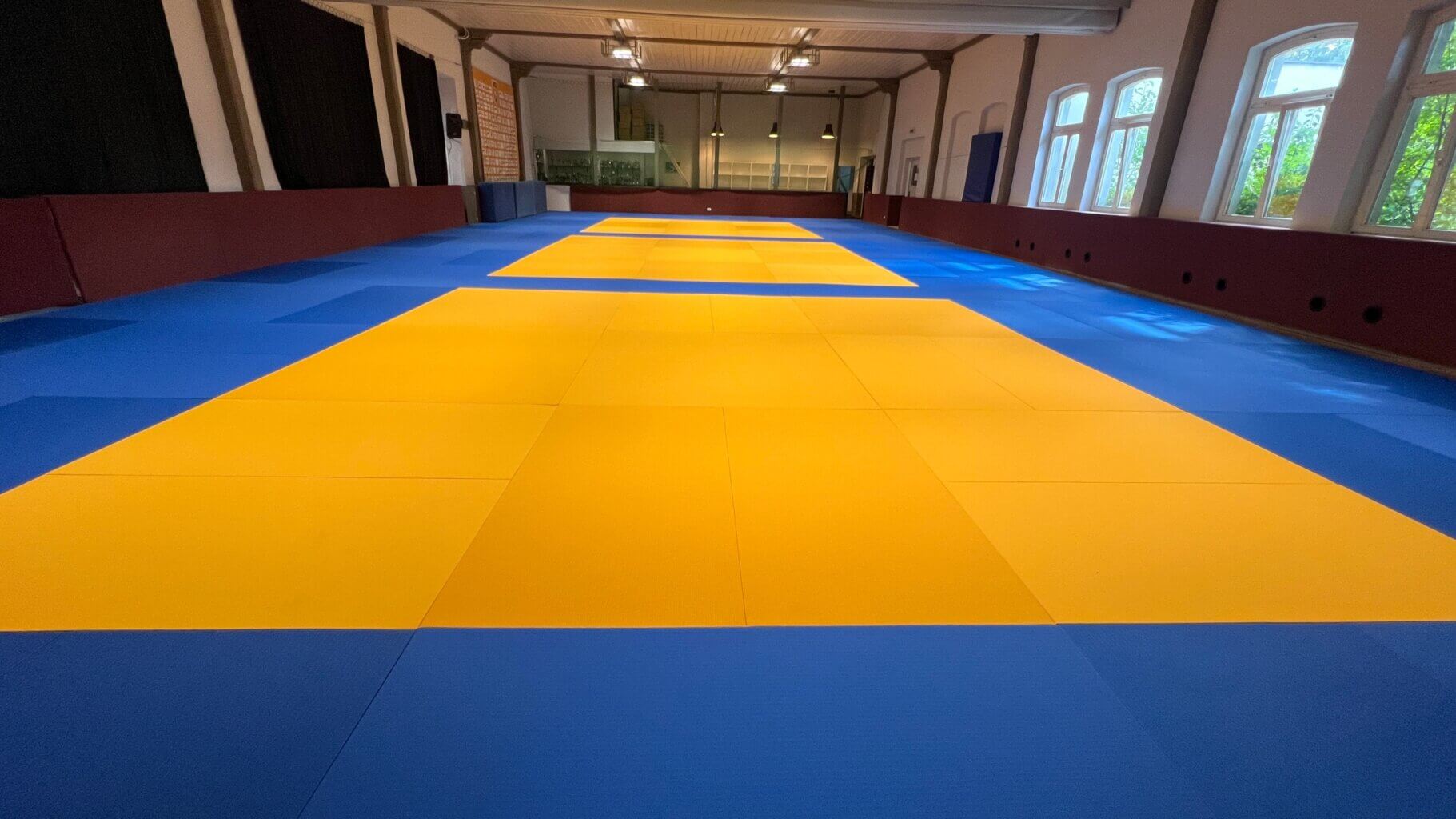 Unsere riesige Judo-Halle ist komplett mit weichen Judo-Matten ausgelegt. Damit ist die Halle optimal für ältere Sportgruppen oder Kampfsportarten geeignet.